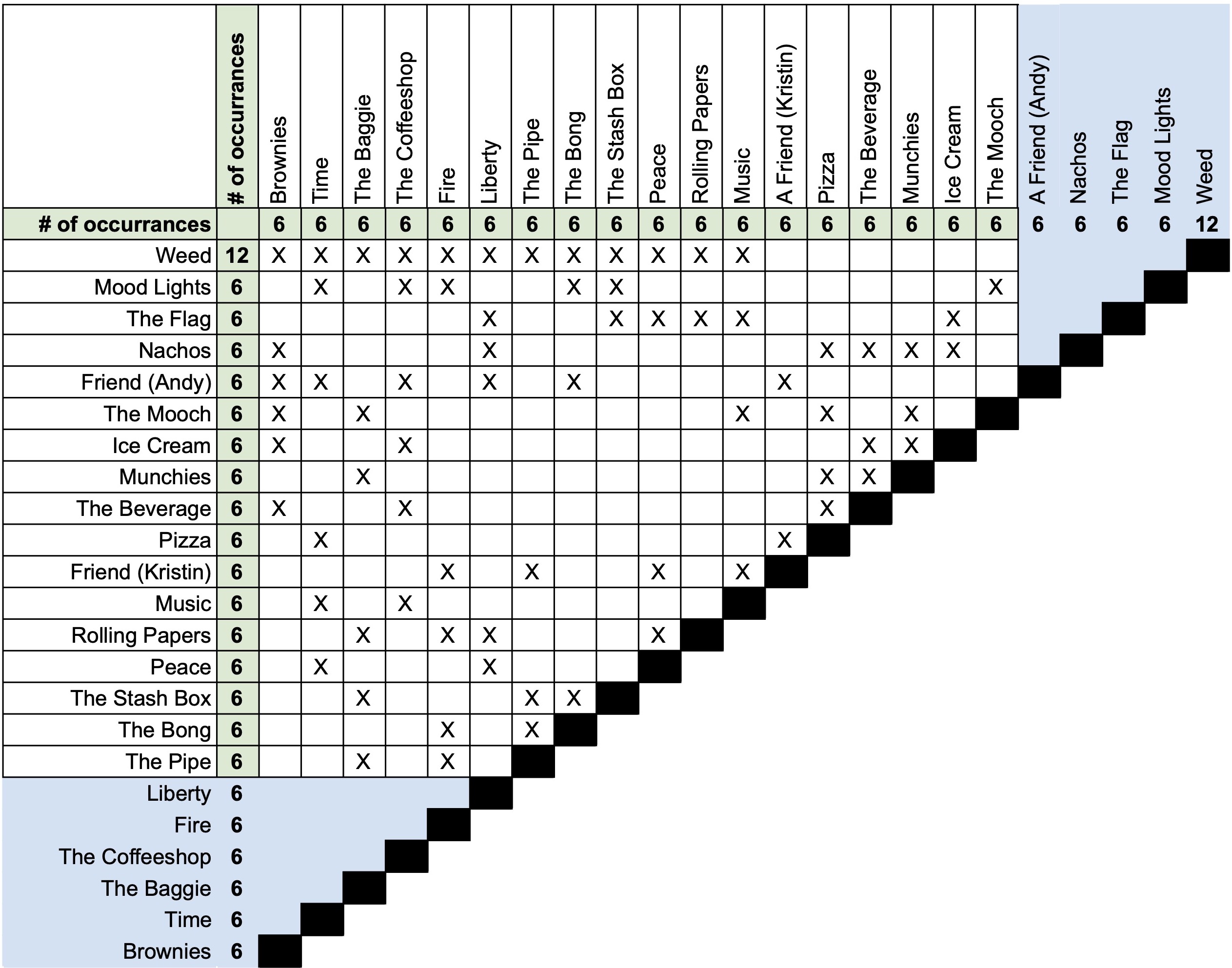 However, the Loonacy deck does not contain every possible combination of the images, so the Xs show which combinations are actually in the deck, with each X representing a card. This makes a total of 100 cards in the box. A rulesheet is also included.